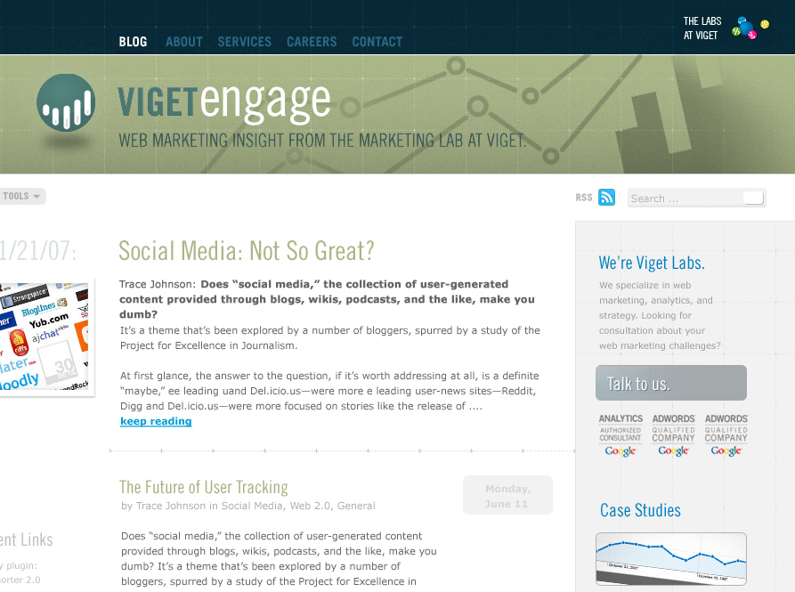 Viget: From the beginning, we’ve been very community-focused; our new office space was even built to handle local events like Barcamp and the DC Design Talks. The blogs are an extension of this thinking. We wanted our team to be able share their insights on specific topics with specific communities. The corporate blog was too general for heavy-duty stuff like Actionscript and analytics, so we split it up by lab. Now, the developers (for example) can blog about Rails plugins more fully knowing their audience is comprised mostly of other developers.