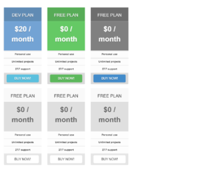 This is an example of a responsive pricing table layout, designed using CSS, HTML, and Bootstrap framework 4. The font style and Bootstrap styles have been imported to the code with their URLs. The concept of Lists has been used with UL and LI components. UL element has been used with the child elements of LI to display the card details, in an orderly manner. The form consists of 2 sets of pricing cards. All the price cards take a box-shadow style of 0px 0px 30px rgba(0,0,0, .2), in a hover event. The upper price cards are given the background colors of #EF5A5C, #73A3D4, #65C965, and #808080. The background color of the white pricing cards is set as #dfdfdf. In a hover event, the panel heading section of the white cards take a box-shadow effect of 0px 0px 30px rgba(0,0,0, .05), whereas the body section takes a text-shadow effect of 0px 2px 0px rgba(250,250,250, .9). The 'Buy Now' buttons have been created as danger, success, primary, info, and default type buttons. Source: https://bootsnipp.com/snippets/3xB5q