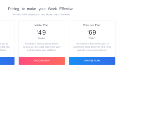 This is another example of a bootstrap card view with pricing cards, toggle buttons, and hover effects, designed using HTML, JavaScript, and CSS. JavaScript functions have been used to implement the toggle feature. Bootstrap fonts and styles are imported to the form with their URLs. The web form is given the styles of font-family as "Montserrat", sans-serif, background color of #8d97ad, and font-weight as 300. The h1 to h6 sections are given a color of #3e4555 and a font-weight of 500, whereas the background color of the form is set to #f4f8fa. The subtitle is given the styles of color as #8d97ad, line-height as 24px, and font-size as 14px. The title of the card is given a font-size of 18px and a line-height of 22px. The cards take a transform effect of scale (1.05) with a transition value of 0.1s, in a hover event. Three choose plan buttons are given the color #2cdd9b and also the linear gradient color of that, for the browsers that support linear gradient colors. In a hover event, the color of the button switch between #2cdd9b and #1dc8cc. The other button is given a gradient color based #ff4d7e, which switches between #ff4d7e and #ff6a5b, in a hover event.