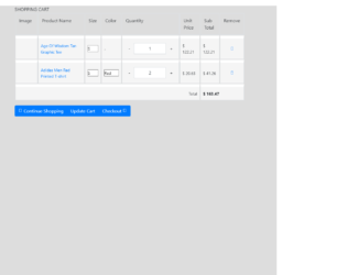 This is an example of a shopping cart table, designed using HTML, CSS, and Bootstrap framework 4. The product images and font styles are imported to the code with their URLs. The form consists of product images, a table that displays the product name and details, price details, drop-down lists, and buttons. The form is split into two sections; the bestseller section and the shopping cart section, and given the styles accordingly. The body of the form is given a background color of #ddd. The table data is displayed with the styles of font-family as FontAwesome, font-style as normal, font-weight as normal, text-decoration as inherit, margin-left as 5px, and font-size as 0.75em. The table headers are displayed using a font color of #344644. The table raws are given a border-bottom value of 2px solid #C2C2C2. The 'Continue Shipping', 'Update Cart', and 'Checkout' buttons are created as primary type buttons.
