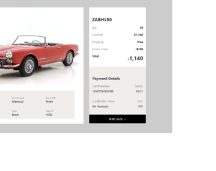 This is an example of a simple checkout form, designed using HTML, CSS, and Bootstrap framework 4. The product image is imported to the code with its URL. The background of the form is given the styles of width as 100%, height as auto, min-height as 100vh, background-color as #cccccc, and background-size as 100% 100%. The product description section is given a background color of #f0edeb. The label names are displayed using a font color of #6c757d, whereas the heading 1 and 2 are displayed using the font sizes of 25px, and 20px, respectively. The payment details card is given a background color as #f0edeb. The purchase link is set as the footer of the form with background color as black and text color as white. The total price is displayed using the styles of font-weight as 700, and font-size as 30px.