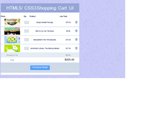 This is a template web form of a shopping cart layout, designed using CSS and HTML. Images and fonts are added into the code with their URLs. The body of the form is given the styles of font-family: 'Helvetica Neue', Helvetica, Arial, sans-serif, font-size: 62.5%, line-height: 1, color: #414141, and background: #caccf7 whereas the background image is added with its URL. The header is given the same font family, color as #fff, text shadow as 1px 2px 0 #7184d8, font size as 3.5em, line height as 1.1em, padding as 6px 0, and text align as center. Quantity Input field is given the styles of width as 33px, height as 22px, border as 1px solid #a3b8d3, background as #dae4eb, color as #616161, and text-align as center. Cursor is set as pointer for remove button and checkout button to display the cursor as a hand. In a hover event, the color of the checkout button changes to gradient(linear, 50% 0%, 50% 100%, color-stop(0%, #4d9cff), color-stop(100%, #338eff)).