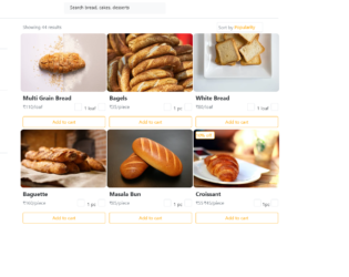 This is an example of an e-commerce product category page with navbar and filters, designed using HTML, CSS, and Bootstrap framework 4. The form consists of a search bar, six product cards with product image, details, and 'Add to Cart' button, and a set of filters created as checkboxes. The product images are imported to the code with their URLs. The concept of Lists has been used with UL and LI components. UL element has been used with the child elements of LI to display the login and shopping cart icons in an orderly manner. The font color RGB(153, 40, 59) has been used to get the burgundy color in text lines. The font-size of the search bar is set as 20px. The product card is given a height of 330px, and a width of 300px, whereas the product image, is given a height of 200px and a width of 250px. The 'Add to cart button is given a border style of 1px solid orange, and background color of #fff. The button takes the background color of orange and font color of #fff, in a hover event.