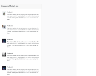 This is a template of a draggable product list with multiple product cards, designed using JavaScript, HTML, CSS, and Bootstrap framework 4. The product images are imported to the code with their URLs. The sortable JavaScript library is used to implement the draggable function of the cards. The body of the form is given a background color as #f9f9fa. The product cards are given a box shadow style of 0 0 1px 2px rgba(0, 0, 0, 0.05), 0 -2px 1px -2px rgba(0, 0, 0, 0.04), 0 0 0 -1px rgba(0, 0, 0, 0.05), whereas the cursor style for the cards is set as 'move', to be able to drag the cards. The card details are displayed using the styles of font-size as 14px, line-height as 1.55556em, padding-left as 5.11111em, and background color as #fff. The product image is given a height and a width as 50px, and border radius as 5px. Media quarries are also used to increase the responsiveness of the form.