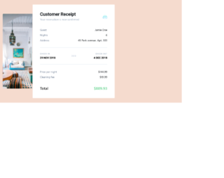 This is an example of a responsive email template with a customer receipt, designed using CSS, HTML, and Bootstrap framework 4. The CSS style sheet is imported to the code from outside, whereas the images and fonts are also imported to the code using URLs. Media queries have been used to increase the responsiveness of the form. The form is given a background color of #f5dbce. The fonts for the form is defined as Roboto, -apple-system, "Segoe UI", sans-serif. The title of the form is given a font-size of 24px, whereas the receipt information section is given a font color of #718096. The customer information section is given the styles of font-weight as 600; text-align as right; width as 50% and align as right. The information container is given the styles of background as #edf2f7, height and line-height as 2px, and font-size as 14px. The check-in and check-out lines are given the styles of color as #a0aec0; font-size as 10px, text-transform as uppercase to automatically convert the text to uppercase, and letter-spacing as 1px, whereas the date information section is given the styles of font-weight as 600, and color as #000000. The total value amount is given the styles of font color as #68d391 and font-size as 20px.