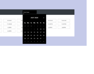 This is an example of a dark themed date and time picker, designed using CSS, HTML, JavaScript, and Bootstrap framework 4. JavaScript methods are used to implement the functionality of the date picker. The body of the form is given a background-color of #C5CAE9, and font color of #000. The information card is given a box-shadow style of 0px 4px 8px 0px #7986CB. The date input field is given the styles of padding as 10px 20px, border as 1px solid #000, border-radius as 10px, background-color as #616161, font color as #fff, font-size as 16px, letter-spacing as 1px, and width as 180px. In a focus event, the input date field takes a border style of 1px solid #512DA8. The date slot of the calendar takes a background color of #eee, in a hover event. In the active mode, the date slot takes a background color of linear-gradient(#90CAF9, #64B5F6), and font color as #000. The Month value of the calendar is displayed using a font-size of 20px, and a text-transform style of uppercase to automatically convert the text to uppercase. The cursor style for the time slots is set as pointer to get the hand cursor effect on a hover event while the background color of the time slot changes to #3D5AFE, in a focus event.