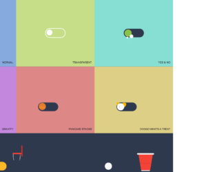 This is an example of a toggle buttons layout with animations, designed using CSS, HTML, and Bootstrap framework 4. The icons and CSS animations are imported to the code with their URLs. Media queries have been used to increase the responsiveness of the form. There are eight toggle button containers named as Normal, Transparent, Yes & No, Gravity, Pancake Stacks, Doggo Wants a Treat, Kobe Bryant Tribute, and Beer Pong. The body of the form is given a background color of #2e394d. The eight toggle button containers are given eight different background colors which are #dec387, #de8797, #87aade, #c5de87, #87ded2, #c487de, #de8787, and #decf87. The name of the toggle button has the styles of font as 500 14px 'Rubik', sans-serif, letter-spacing as .5px, text-transform as uppercase, and text-shadow as 0 1px 1px rgba(0,0,0,0.4). The toggle button is given the styles of width as 7em, background as #2e394d, height as 3em, border-radius as 50px, transition as all .3s ease, transform-origin as 20% center, and cursor as pointer. The toggle buttons are given different animation styles to work on a checked event.